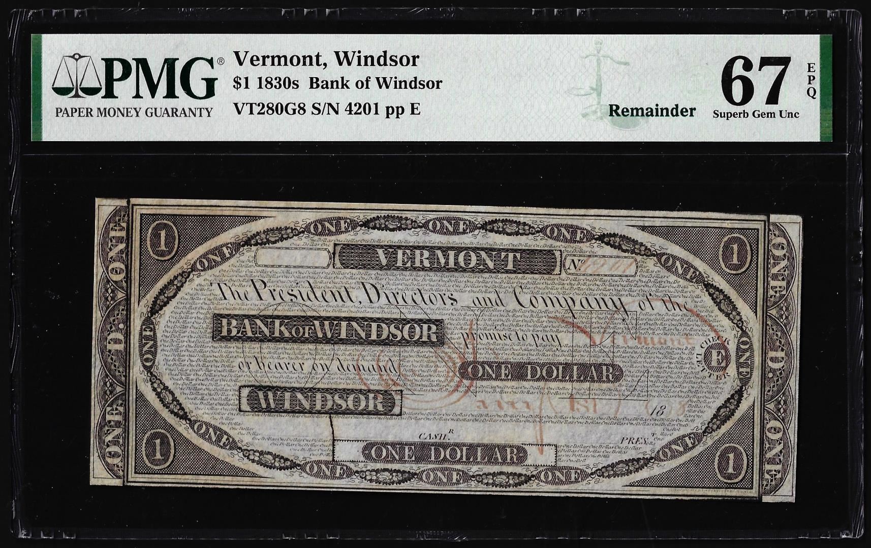 One 1830's $1 Bank of Windsor Vermont Remainder Obsolete Note PMG Superb Gem Unc 67EPQ. PMG Certified.