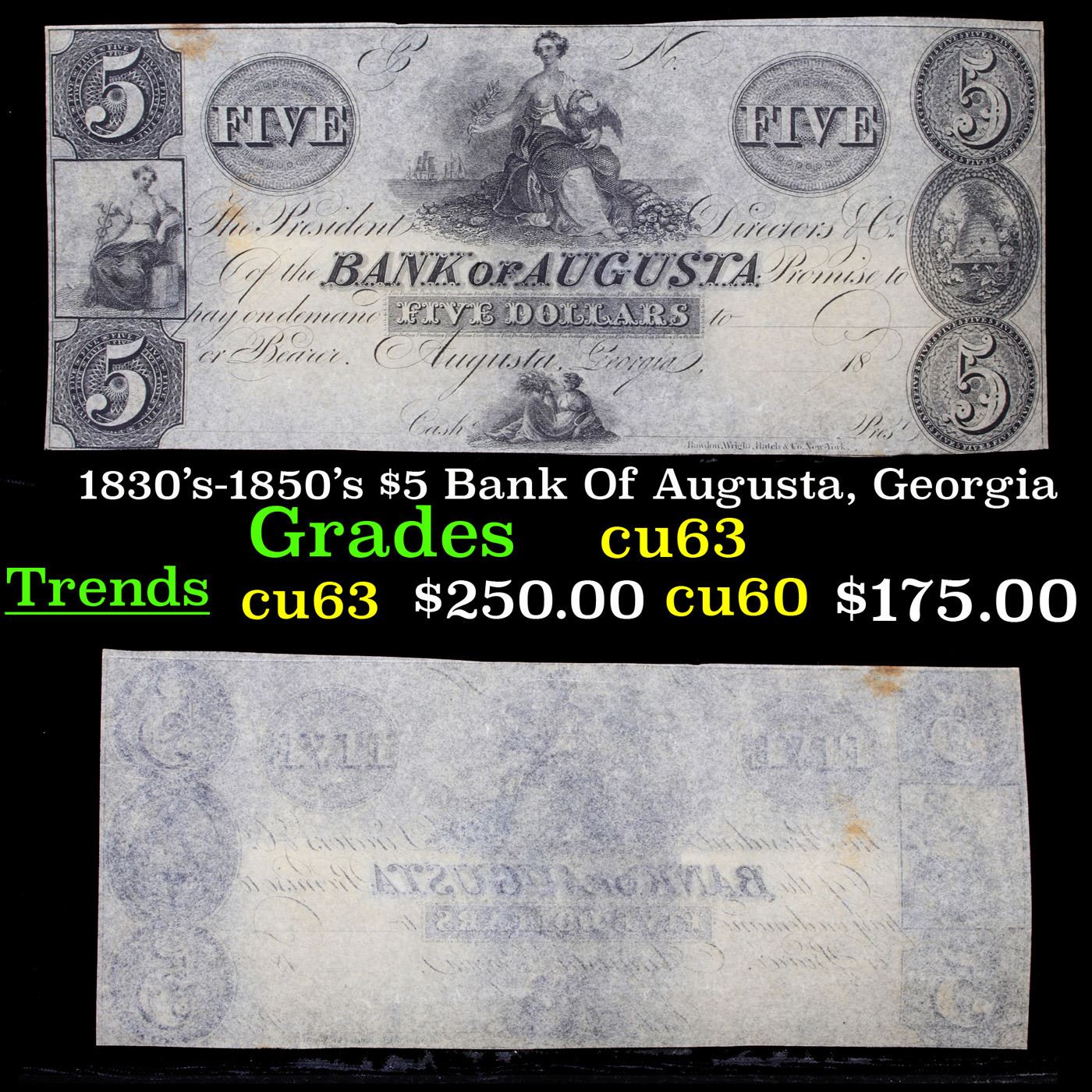 1830's-1850's $5 Bank Of Augusta, Georgia Grades Select CU