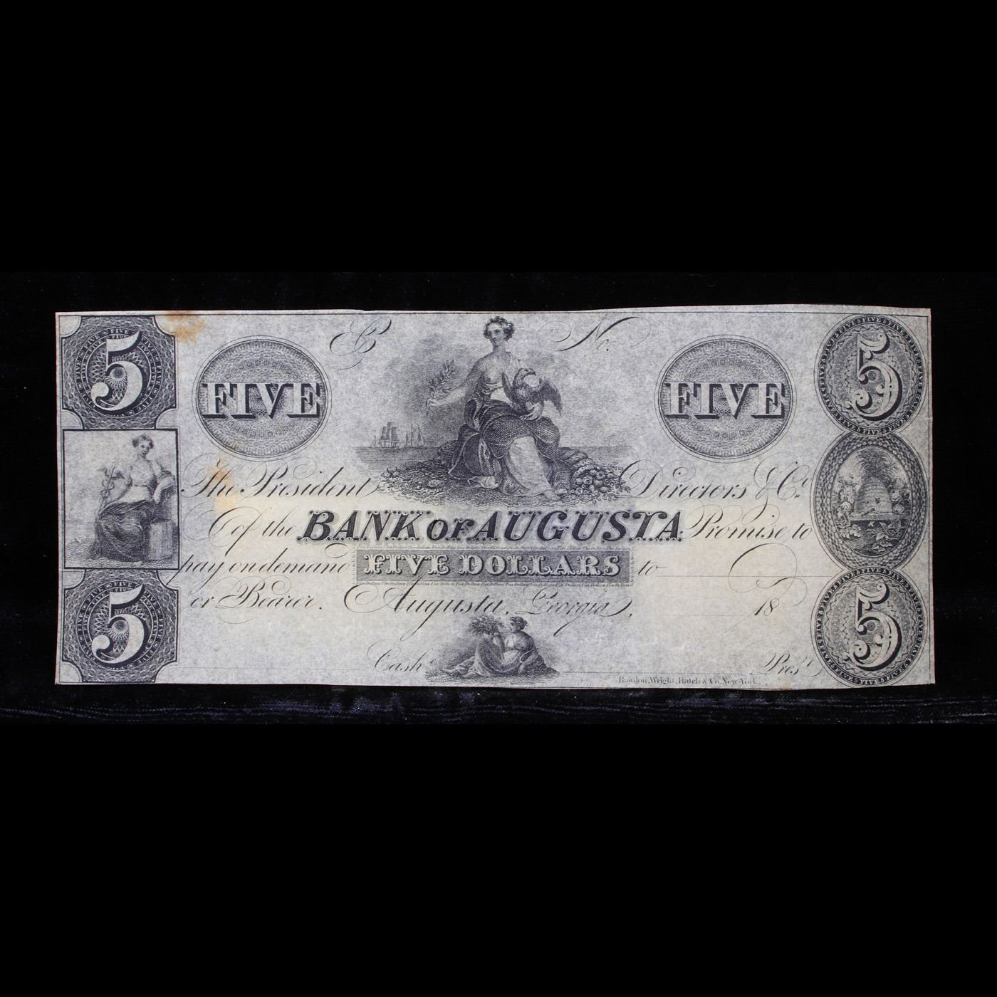 1830's-1850's $5 Bank Of Augusta, Georgia Grades Select CU. This note features a Vignette of an allegorical maiden seated with an eagle by the shore with a cornucopia overflowing at her feet. On the right is a beehive, representing Industry, between "5" counters. Commerce sits between "5" blocks on the left.