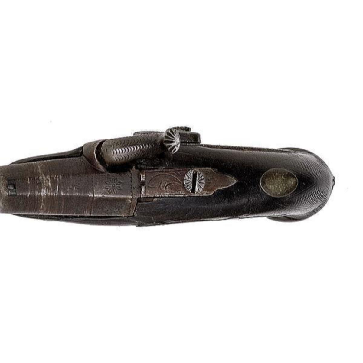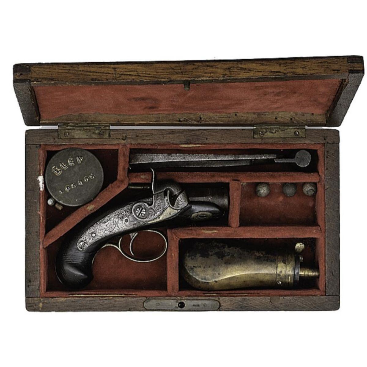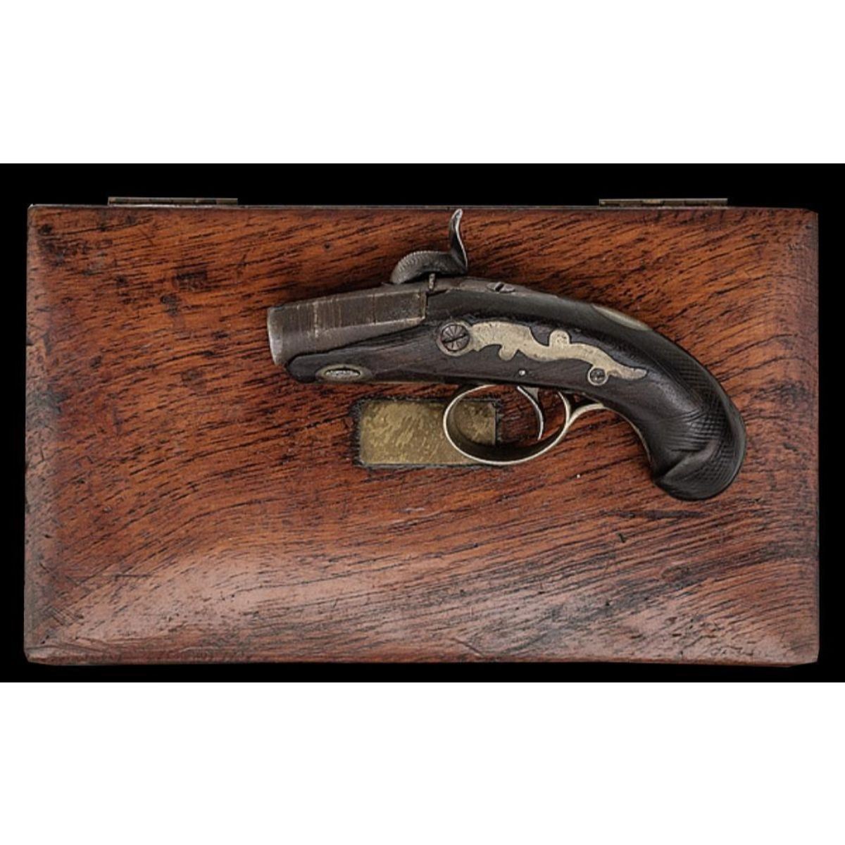 Cased percussion derringer "PEANUT" size, .40 cal., 1" Barrel, overall length 4.5". Left side of barrel with two asterisks engraved and one on top of the breech flat. Engraved lock. German silver furniture. Checkeredwalnut stock. Case is an old dovetail mahogany case with red lining. Derringer has proper style mold with a small plain flask.