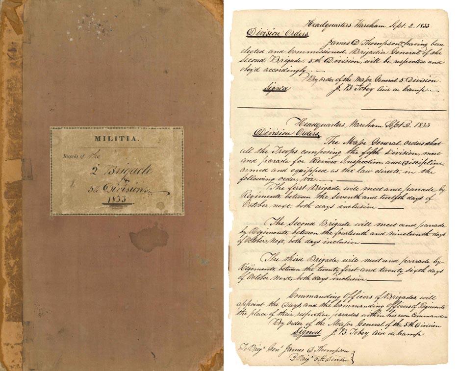 Pre-Civil War military documents, handwritten in elegant cursive with over 110pp. detailing the elections of field officers, as well as military officials tried for indiscretions. Entries date from 1833 to 1840 with varying headquarters based in New Bedford, Wareham, Boston and Pawtucket. Reads in part, ''...the court sentenced the said Maj. John P. Jones to be removed from office and do adjudge him to be disqualified for and incapable of holding any military office...'' Front cover of the book is separated, else very good condition.