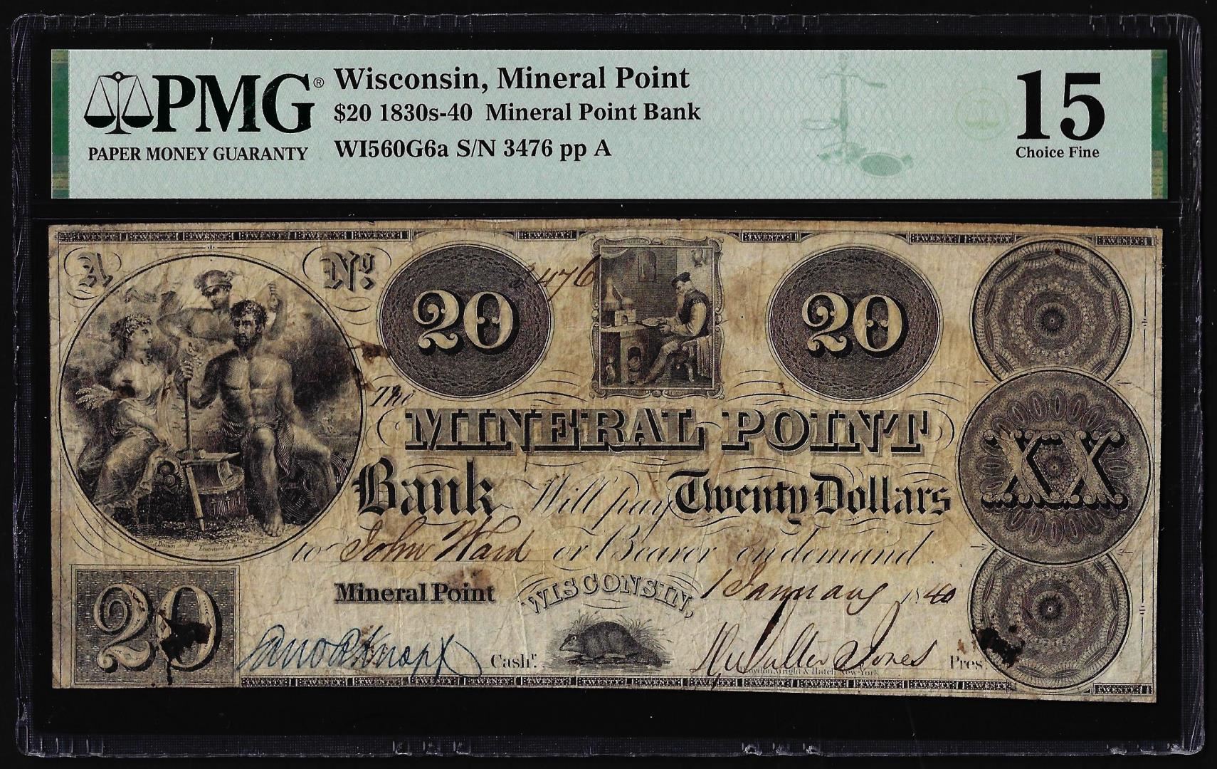 One 1830s-40 $20 Mineral Point Bank Wisconsin Obsolete Note WI560G6a PMG Choice Fine 15. PMG Certified.