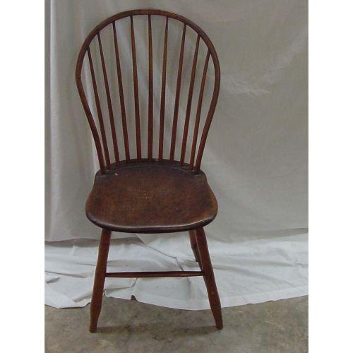 Mixed woods but mostly Oak and Hickory, delicately turned spindle back with sensuously curved sides, turned stretcher base, Poplar solid board seat, old repairs to the legs and top of the curving on the chair but the chair is now structurally sound and good for normal use. 36 1/2" tall by 15" wide and deep. Circa 1830-45 and found in Connecticut years ago, old refinished surface.