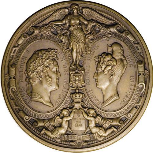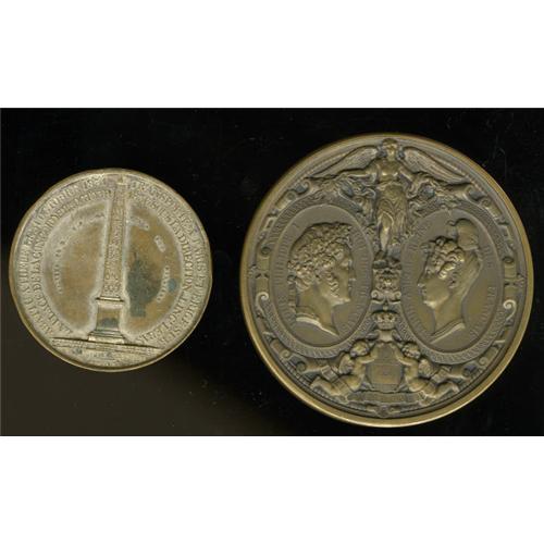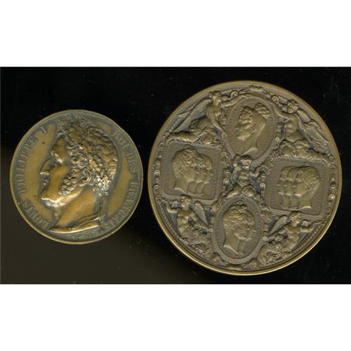 <B>1830s Louis Phillippe I Medals.</B></I> Includes two bronze medals issued during the reign of Louis Philippe I of France. The first (and the nicer of the two) was issued in 1833 to commemorate the royal visit to the Paris Mint, a large (about 75 mm), ornate medal with the word "bronze" and a quiver stamped into the edge; this is the Paris Mint mark. The second medal was issued to commemorate the completion of the Obelisque de Louqsor (Obelisk of Luxor). At the top are two holes that must have been used to mount a ring for wearing; the name of the engraver is under the bust of Louis, "Montagny F." A nice pair of French medals that should draw considerable attention. Market value is approximately $125-$200.<BR><BR><b>Shipping:</b> Coins & Currency (<a target="_blank" href="http://www.heritageauctions.com/common/shipping.php">view shipping information</a>)