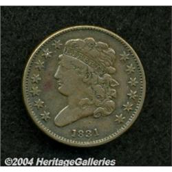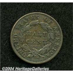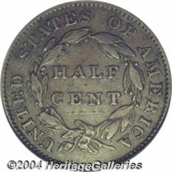 <B>1831<1/2 C> Impaired Proof, Corroded, NCS (VF30 Corroded).</B></I> Original. B-1, C-1, High R.6. This specimen is very similar in grade and quality to the Dr. Montgomery example, which we sold in our 1997 ANA auction; however, these are two different coins. In his <I>Half Cent Encyclopedia,</B></I> Walter Breen listed 21 different circulation strike examples along with nine proofs. We believe that these 30 citations represent about 25 different coins. For many years, the 1831 half cent was considered to be a proof-only issue. Today, however, the consensus of opinion suggests that a small quantity were produced with the intention of entering circulation. Proofs were also coined, including two different restrikes produced in the 1850s or possibly later. This example has pleasing light brown and olive coloration with a small area of deep red patina in the left obverse field. Very light verdigris is present around certain of the reverse letters, and we believe that this could easily be removed with a little patience. The surfaces are typical of a lightly circulated half cent from this era, having just the slightest imperfections. If you have been searching for an example of this issue for your collection, the present sale provides a remarkable bidding opportunity.<BR><I>From The Paulsboro Collection, Part Three.</B></I> <BR><BR><B>Important notice:</B> Heritage usually auctions material at the rate of 200-250 lots per hour. On some occasions eBay Live bid software or the Internet may not be able to keep up with the pace of the auction. We recommend placing a realistic absentee bid now as insurance to avoid disappointment. Occasionally the auctioneer may eliminate or reject an eBay Live bid, and the auctioneer may also reopen a lot after the close of the eBay live bidding (usually because we missed an audience bid), and may reject your bid even if it shows you as the winning bidder. By bidding via eBay Live, you agree that Heritage may award the lot to another bidder at its sole discretion under the circumstances described above or any other reasonable circumstances. Since eBay bids are not shown to us until we open the lot on the floor, we treat those bids just like floor bids. In most cases the floor responds before the eBay bid is presented to us, due to Internet lag time, so for consistency we have made it a policy that floor bids are always considered first over tie eBay live bids. Also please note that all Heritage lots purchased through eBay Live carry a 20% Buyer's Premium. Please make sure you read the Terms and Conditions before you bid. </span></font></tr></table></td></tr></table>
