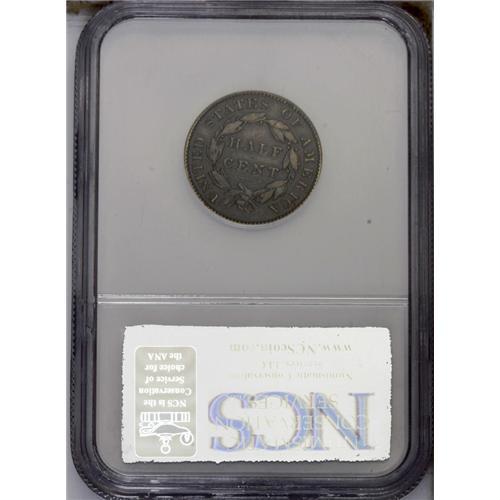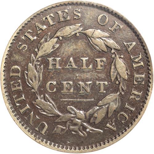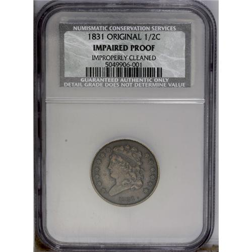 <B>1831<1/2 C>--Impaired Proof, Improperly Cleaned--NCS.</B></I> Original. B-1, C-1, High R.6. In his <I>Half Cent Encyclopedia,</B></I> Walter Breen listed 21 different circulation strike examples along with nine proofs. We believe that these 30 citations represent about 25 different coins. For many years, the 1831 half cent was considered to be a proof-only issue. Today, however, the consensus of opinion suggests that a small quantity were produced with the intention of entering circulation. Proofs were also coined, including two different restrikes produced in the 1850s or possibly later. This example has pleasing medium reddish-brown and olive coloration. The surfaces are typical of a lightly circulated half cent from this era, having some minor imperfections. If you have been searching for an example of this issue for your collection, the present sale provides a remarkable bidding opportunity. EAC 12.<BR><I>From The Steve Glenn Collection.</B></I> <BR><BR><B>Important notice:</B> Heritage usually auctions material at the rate of 200-250 lots per hour. On some occasions eBay Live bid software or the Internet may not be able to keep up with the pace of the auction. We recommend placing a realistic absentee bid now as insurance to avoid disappointment. Occasionally the auctioneer may eliminate or reject an eBay Live bid, and the auctioneer may also reopen a lot after the close of the eBay live bidding (usually because we missed an audience bid), and may reject your bid even if it shows you as the winning bidder. By bidding via eBay Live, you agree that Heritage may award the lot to another bidder at its sole discretion under the circumstances described above or any other reasonable circumstances. Since eBay bids are not shown to us until we open the lot on the floor, we treat those bids just like floor bids. In most cases the floor responds before the eBay bid is presented to us, due to Internet lag time, so for consistency we have made it a policy that floor bids are always considered first over tie eBay live bids. Also please note that all Heritage lots purchased through eBay Live carry a 20% Buyer's Premium. Please make sure you read the Terms and Conditions before you bid. This lot is being auctioned in conjunction with a live floor auction by Heritage Galleries & Auctioneers. All final auction and invoice information will be supplied by Heritage Galleries & Auctioneers, and all other information should be considered preliminary. Lot:230 <BR><BR><B>Winning Notification and Billing:</B> After the FINAL session in this auction is complete, Heritage will send e-mail and snail mail invoices. This process normally takes several days. All final auction and invoice information will be supplied by Heritage Galleries & Auctioneers, and all other information should be considered preliminary. <BR><BR>This auction will be conducted on a live auction floor and over the Internet through eBay Live. If you choose to place an absentee bid, please take a moment to <font color='#0000ff'><u><a href='http://pages.ebay.com/liveauctions/help/before/laabsentee.html'>learn how eBay Live absentee bidding works</a></u></font><font color='#000000'>