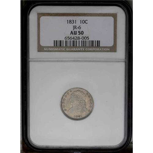 <B>1831<10C> JR-6, R.3. Reiver state a. AU50 NGC.</B></I> Traces of luster in the fields and sharply impressed. Medium silver with light peripheral gold and pleasing. One minor scratch is seen in Liberty's cap and the obverse has a thin die crack through the first four stars.<BR><I>Ex: Coin Galleries (May 1987).</B></I> Envelope Included.