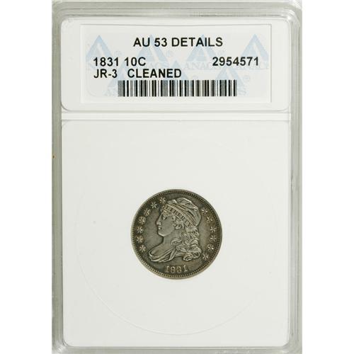 <B>1831 10C --Cleaned--ANACS. AU53 Details.</B></I> JR- 3. NGC Census: (4/216). PCGS Population (15/169). Mintage: 771,350. Numismedia Wsl. Price: $300. (#4520)<BR><BR><b>Shipping:</b> Coins & Currency (<a target="_blank" href="http://www.heritageauctions.com/common/shipping.php">view shipping information</a>)