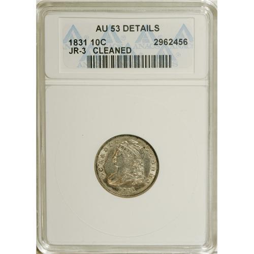 <B>1831 10C --Cleaned--ANACS. AU53 Details.</B></I> JR-3. NGC Census: (4/216). PCGS Population (15/169). Mintage: 771,350. Numismedia Wsl. Price for NGC/PCGS coin in AU53: $300. (#4520)<BR><BR><b>Shipping:</b> Coins & Currency (<a target="_blank" href="http://www.heritageauctions.com/common/shipping.php">view shipping information</a>)