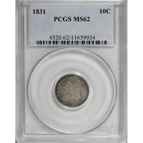 <B>1831 10C MS62 PCGS.</B></I> JR-1, R.1. Nicely struck and lustrous. This attractive dime has the eye appeal of a higher-grade example. Intense patches of blue, maroon, and gold are seen at the edges while the reverse has more even rainbow coloration. <BR><BR><B>Coin Engraver:</B> John Reich<BR><BR><b>Shipping:</b> Coins & Currency (<a target="_blank" href="http://www.heritageauctions.com/common/shipping.php">view shipping information</a>)