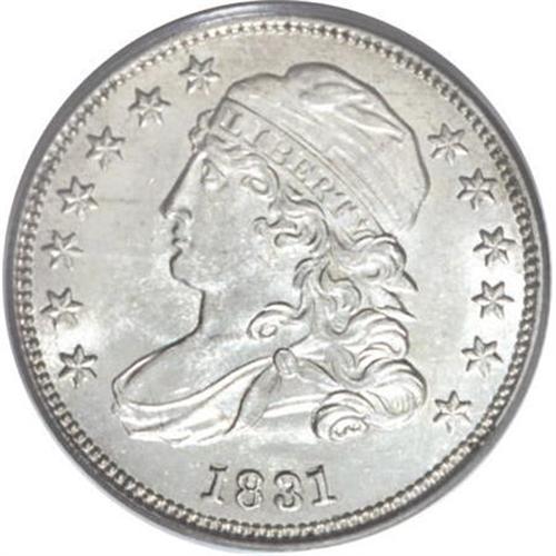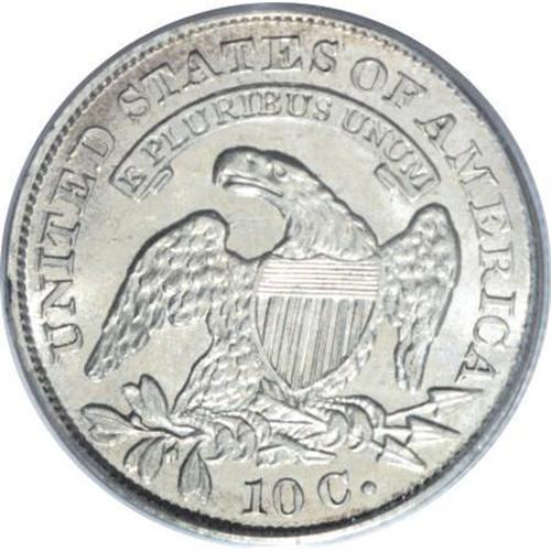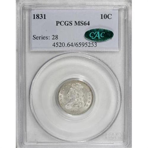 <B>1831 10C MS64 PCGS. CAC.</B></I> JR-5, R.1. Hints of olive toning visit this unabraded near-Gem. Well struck save for minor merging of detail on the vertical shield stripes and right (facing) claw. Lightly die clashed (as made) near Liberty's ear and above the date. Population: 36 in 64, 23 finer (11/07).<BR><I>From The Parker Lee III Collection.</B></I><BR><BR><B>Coin Engraver:</B> John Reich<BR><BR><b>Shipping:</b> Coins & Currency (<a target="_blank" href="http://www.heritageauctions.com/common/shipping.php">view shipping information</a>)
