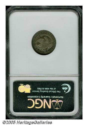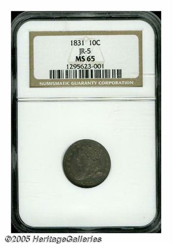 <B>1831<10C> MS65 NGC.</B></I> JR-5, R.1. Rich layers of golden and steel-blue cover both sides. The underlying surfaces are boldly detailed and reveal unmistakable signs of die clashing on the obverse. While far from a scarcity within the Capped Bust series, any Gem representative of this early type is a significant offering. Population: 21 in 65, 15 finer (4/05).