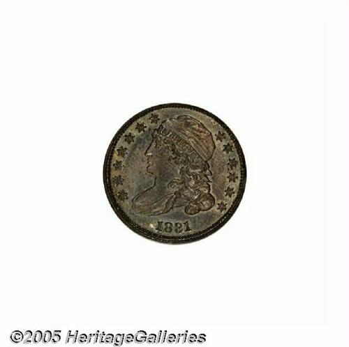 <B>1831<10C> MS65 NGC.</B></I> JR-5, R.1. Rich layers of golden and steel-blue cover both sides. The underlying surfaces are boldly detailed and reveal unmistakable signs of die clashing on the obverse. This beautifully toned and exceptionally preserved Gem would be a desirable addition to a high grade early silver type set. Population: 21 in 65, 15 finer (6/05).