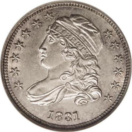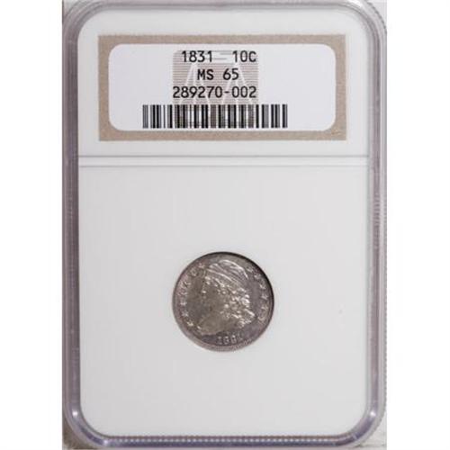 <B>1831 10C MS65 NGC.</B></I> JR-6, R.3. A lustrous and exactingly struck Gem with pale rose borders and an impressively unabraded appearance. A die crack connects the rim to the first three stars, and clash marks from the shield are present near Liberty's ear. The reverse die is perfect.<BR><I>From The Arnold & Harriet Collection.</B></I><BR><BR><B>Coin Engraver:</B> John Reich<BR><BR><b>Shipping:</b> Coins & Currency (<a target="_blank" href="http://www.heritageauctions.com/common/shipping.php">view shipping information</a>\)