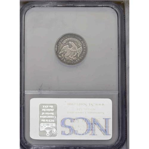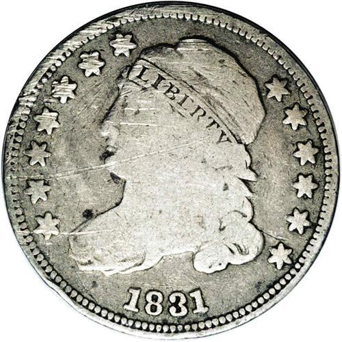 <B>1831<10C> JR-5, R.1. Reiver state b.--Obverse Scratched--NCS. VG Details.</B></I> The obverse has a rather heavy scratch from the rim through the second star, Liberty's chin to the Y in her headband, another shorter scratch crosses the first star to her bust. Several shorter scratches are located on the upper left obverse many of which scuff the stars and continue on Liberty's face and cap. Light silver devices, darker gray in the fields. The reverse is interesting for the very late full cud over UNI to the tops of those letters. This die state is scarce but is one of the more obtainable full cuds in the series.<BR><I>Ex: Vern Marshall (March 1998).</B></I> Envelope Included.