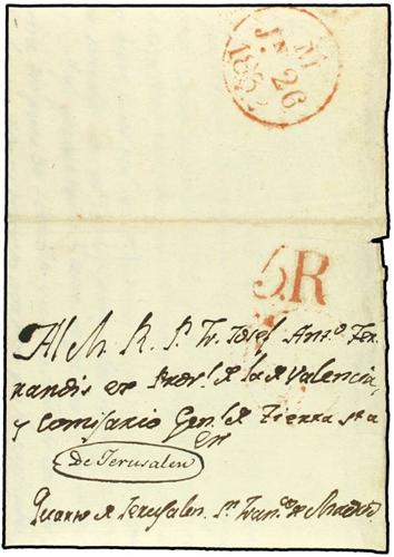 1831 (11-Sept) JERUSALEM a ESPAÑA. Carta enviada por un Fraile Franciscano al procurador General de Tierra Santa en Madrid. Indicación manuscrita "DE JERUSALEM" circulada por el CORREO ESPAÑOL DEL LEVANTE, via Malta y napoles y Livorno, en el interior manuscrito "abierta en la quarentena de Liorno". fechador de llegada de Madrid al dorso y tasa de "5 reales". Extraordinariamente rara y una de las pocas conocidas con marca de origen del Correo Español en Tierra Santa.