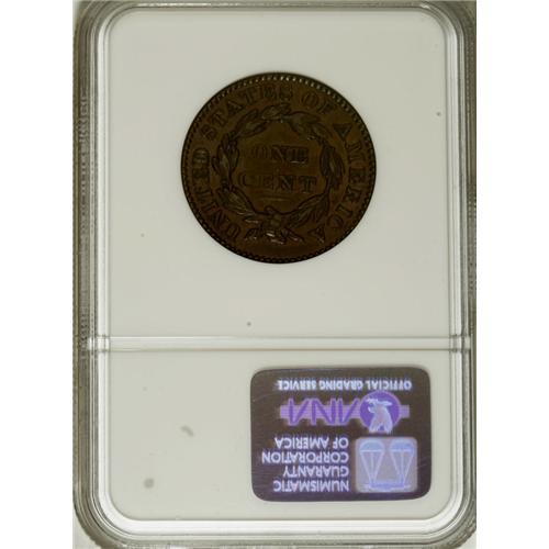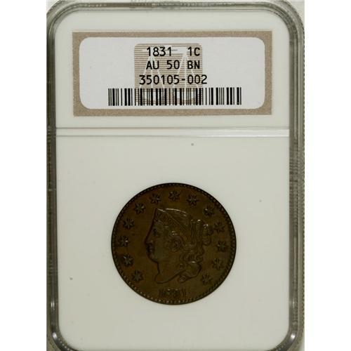 <B>1831 1C Large Letters AU50 NGC.</B></I> NGC Census: (12/270). PCGS Population (9/69). Mintage: 3,359,260. Numismedia Wsl. Price for NGC/PCGS coin in AU50: $195. (#1678)<BR><BR><b>Shipping:</b> Coins & Currency (<a target="_blank" href="http://www.heritageauctions.com/common/shipping.php">view shipping information</a>)