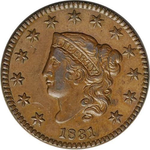 <B>1831<1C> Large Letters. N-10, R.3. AU58 NGC. XF40 EAC.</B></I> Early Die State. Curved even date with thick peaked 1's. IBERTY is recut. On the reverse, the C in CENT is almost closed, and there is a small die defect at the base of T in CENT. Well struck with the reverse rotated counterclockwise by approximately twenty degrees. Bright red-tan color on both sides, with some steel-gray toning on the worn obverse highpoints. A couple of small contact marks are noticeable on Liberty's lower cheek.<BR><I>Ex: Aaron's Coins (3/18/1981).</B></I> Envelope Included.
