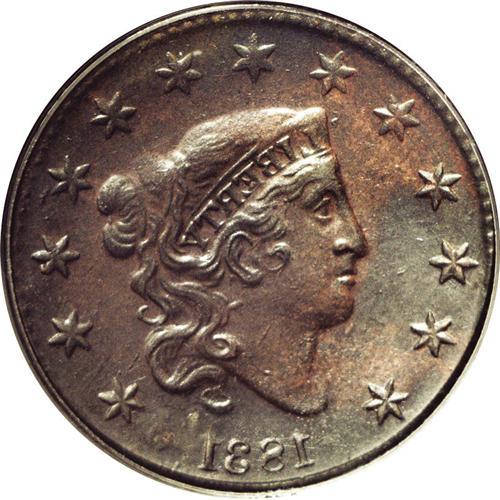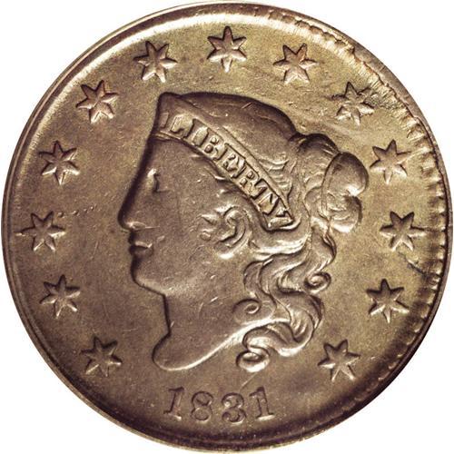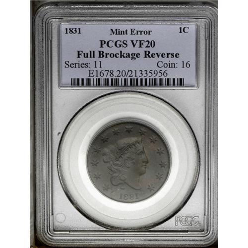 <B>1831<1C> Large Letters--Full Brockage Reverse--VF20 PCGS.</B></I> N-10, R.3. The reverse of this coin is a brockage image of the obverse, thus the normal obverse is present, along with an incuse mirrored image of the obverse. Attribution is confirmed by the presence of a narrow rim break in the dentils over star 9, a hallmark of late die states of this obverse die. The obverse has intermingled steel and olive color with mixed steel and deep orange on the brockage side. Although obviously cleaned and retoned, it is an attractive example, and highly desirable as well. EAC 10. <BR><BR><B>Important notice:</B> Heritage usually auctions material at the rate of 200-250 lots per hour. On some occasions eBay Live bid software or the Internet may not be able to keep up with the pace of the auction. We recommend placing a realistic absentee bid now as insurance to avoid disappointment. Occasionally the auctioneer may eliminate or reject an eBay Live bid, and the auctioneer may also reopen a lot after the close of the eBay live bidding (usually because we missed an audience bid), and may reject your bid even if it shows you as the winning bidder. By bidding via eBay Live, you agree that Heritage may award the lot to another bidder at its sole discretion under the circumstances described above or any other reasonable circumstances. Since eBay bids are not shown to us until we open the lot on the floor, we treat those bids just like floor bids. In most cases the floor responds before the eBay bid is presented to us, due to Internet lag time, so for consistency we have made it a policy that floor bids are always considered first over tie eBay live bids. Also please note that all Heritage lots purchased through eBay Live carry a 20% Buyer's Premium. Please make sure you read the Terms and Conditions before you bid. This lot is being auctioned in conjunction with a live floor auction by Heritage Galleries & Auctioneers. All final auction and invoice information will be supplied by Heritage Galleries & Auctioneers, and all other information should be considered preliminary. Lot:279 <BR><BR><B>Winning Notification and Billing:</B> After the FINAL session in this auction is complete, Heritage will send e-mail and snail mail invoices. This process normally takes several days. All final auction and invoice information will be supplied by Heritage Galleries & Auctioneers, and all other information should be considered preliminary. <BR><BR>This auction will be conducted on a live auction floor and over the Internet through eBay Live. If you choose to place an absentee bid, please take a moment to <font color='#0000ff'><u><a href='http://pages.ebay.com/liveauctions/help/before/laabsentee.html'>learn how eBay Live absentee bidding works</a></u></font><font color='#000000'>