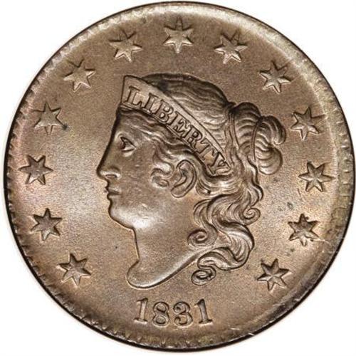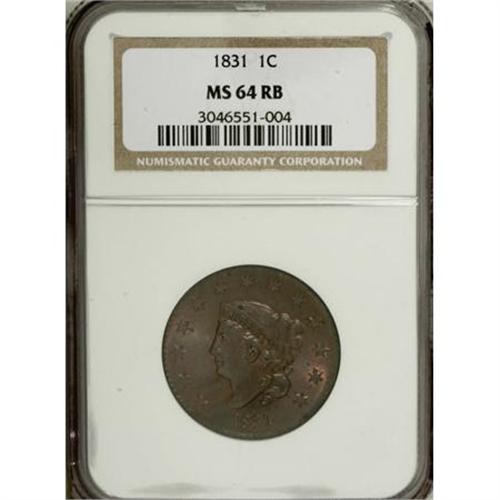 <B>1831 1C Small Letters MS64 Red and Brown NGC.</B></I> N-3, R.1. Shimmering luster bathes this attractive cent, which has smooth fields and a generous quotient of orange-red, particularly across the reverse. The portrait and obverse field are medium brown. The obverse has a few small carbon spots, and a faded thin mark behind the eye. Census: 1 in 64 Red and Brown, 3 finer (6/07). EAC 60+.<BR><BR><B>Coin Engraver:</B> Robert Scot or John Reich<BR><BR><b>Shipping:</b> Coins & Currency (<a target="_blank" href="http://www.heritageauctions.com/common/shipping.php">view shipping information</a>)