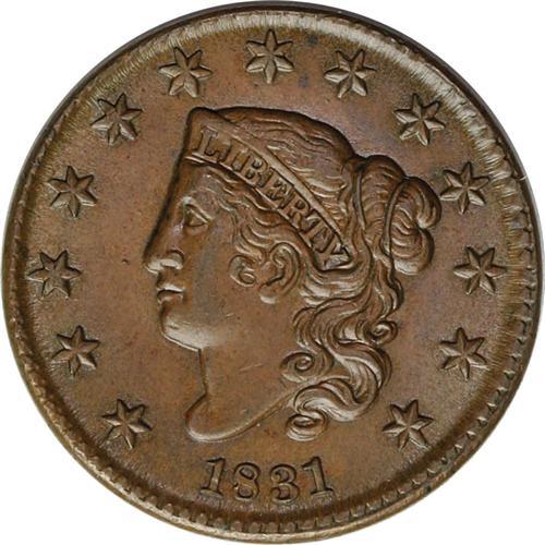 <B>1831<1C> Large Letters. N-14, High R.4--Reverse Scratched--NCS. Unc Details. AU50 EAC.</B></I> Late Die State. Even curved date with thick peaked 1's; strong inner obverse rim circle; star 1 near point of bust. Mahogany and steel-green toning is evident over both sides. Several graffiti-like scratches are evident just above the lower reverse rim at 6 o'clock, but they are very superficial.<BR><I>Ex: Garry Fitzgerald (11/13/1968).</B></I> Envelope Included.