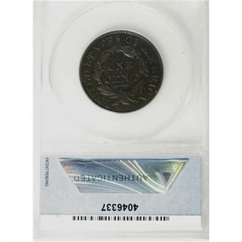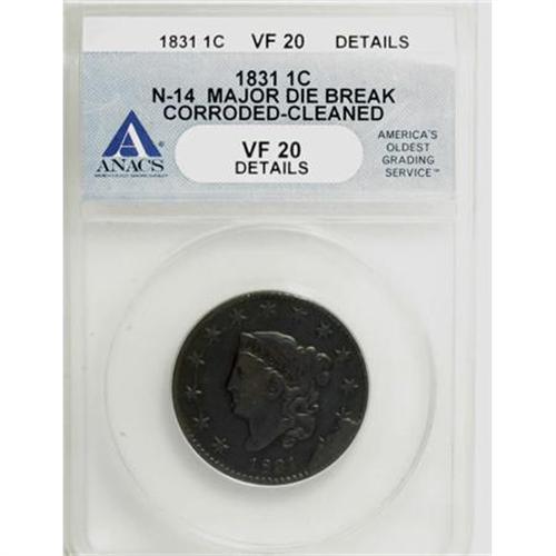 <B>1831 1C Large Letters--Corroded, Cleaned--ANACS. VF20 Details.</B></I> N-12, R.1. Die State D. Erroneously listed as "N-14, Major Die Break" on the holder. The latest state identified, this rim break covers eight points of stars 12 and 13. The chocolate-brown surfaces show moderate wear, evidence of past corrosion, and remnants of past efforts to remove said corrosion. A slightly inferior example in our Reiver Sale realized over $1,200. EAC 10.<BR><BR><B>Coin Engraver:</B> Robert Scot or John Reich<BR><BR><b>Shipping:</b> Coins & Currency (<a target="_blank" href="http://www.heritageauctions.com/common/shipping.php">view shipping information</a>)