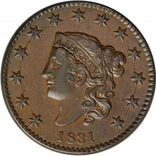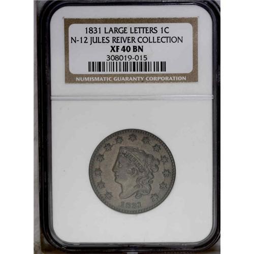 <B>1831<1C> Large Letters XF40 NGC.</B></I> N-12, R.1. A late stage of Die State A, the die break near 5 o'clock reaches beyond star 13, and almost halfway to the date. A dark red-brown example with even wear on the obverse and reverse highpoints. Envelope Included.