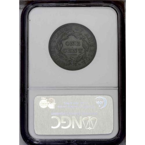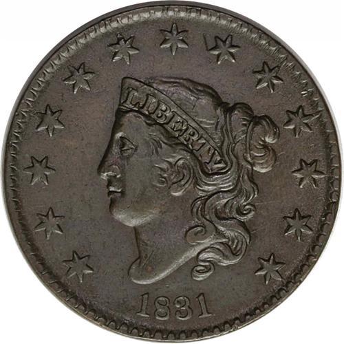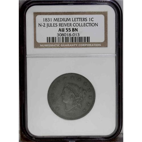 <B>1831<1C> Medium Letters. N-2, R.2. AU55 NGC. VF25 EAC.</B></I> A briefly circulated mahogany-brown representative that has a reasonable strike and is disturbed only by a few light if lengthy pinscratches near ONE CENT. The three Es in UNITED STATES IN AMERICA are all missing their lower left serifs, presumably because of a defective punch.<BR><I>Ex: George Ramont (8/5/1969).</B></I> Envelope Included.