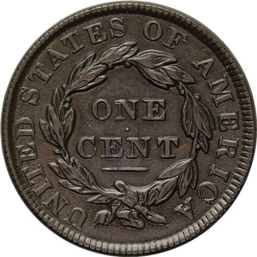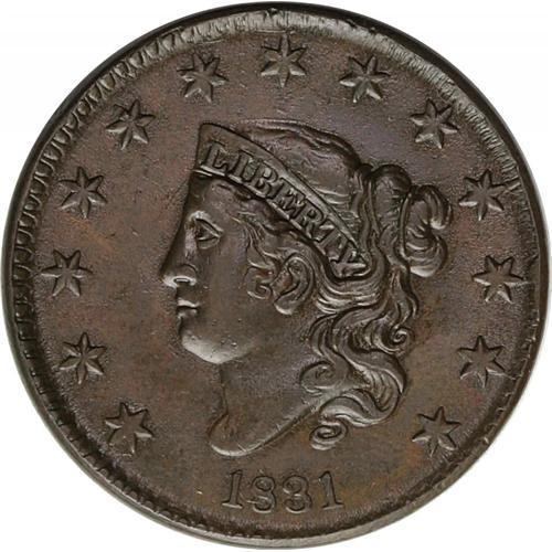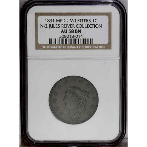 <B>1831<1C> Medium Letters. N-2, R.2. AU58 NGC. VF30 EAC.</B></I> A small cud has developed on the rim above star 11, not present on the preceding two lots. This smooth dark brown example is bold and only lightly worn. A faint fingerprint is noted on the reverse near 6 o'clock, and the upper obverse rim shows some flattening damage.<BR><I>Ex: George Ramont (2/28/1977).</B></I> Envelope Included.