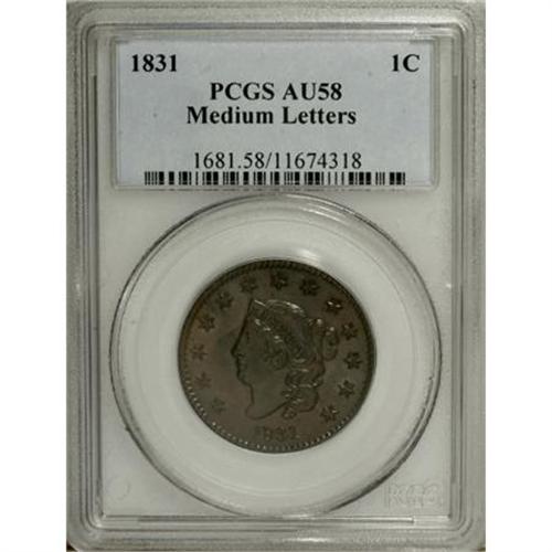 <B>1831 1C Medium Letters AU58 PCGS.</B></I> PCGS Population (3/5). NGC Census: (0/0). (#1681)<BR><BR><b>Shipping:</b> Coins & Currency (<a target="_blank" href="http://www.heritageauctions.com/common/shipping.php">view shipping information</a>)
