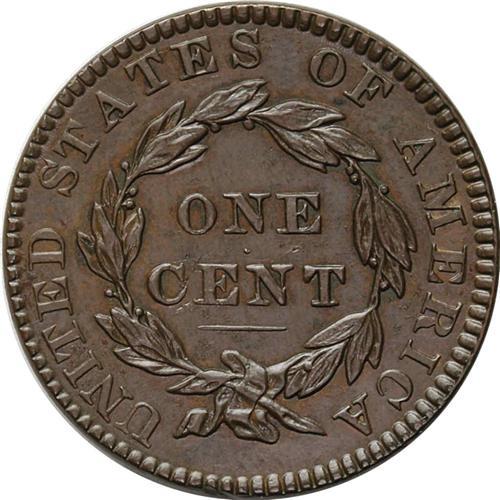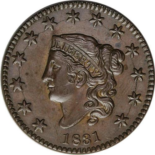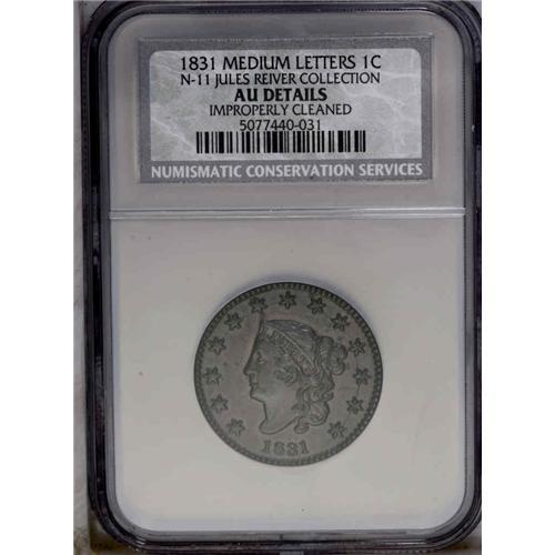 <B>1831<1C> Medium Letters. N-11, R.2--Improperly Cleaned--NCS. AU Details. AU50 EAC.</B></I> Early Die State. Base of T in LIBERTY rests on hair. A die crack originates and ends near the date, after extending through all of the obverse stars. Dark olive-brown coloration blankets both sides of the coin. Two or three contact marks are noticeable near the center of each side. A slight milky haze in the fields may be related to improper cleaning.<BR><I>Ex: George Ramont (8/8/1971).</B></I> Envelope Included.
