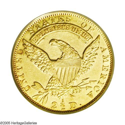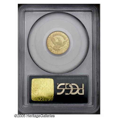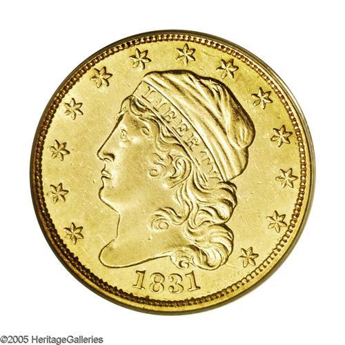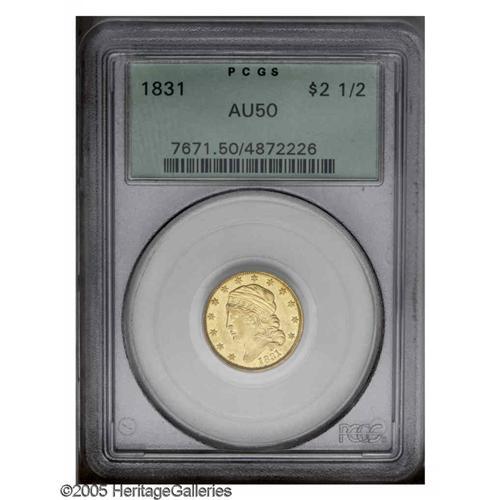 <B>1831<$2 1/2> AU50 PCGS.</B></I> Only one pair of dies was used to strike 1831 quarter eagles, and given the low mintage of 4,520 pieces, it comes as no surprise that the issue is rare across all grades. This apricot-gold example is crisply struck aside from the left border of the eagle's shield, and no marks are remotely worthy of discussion. Although each date is individually rare, a collection of reduced diameter Capped Head quarter eagles (1829 to 1834) is achievable, with the 1834 Motto as the key to the short but very challenging series. Certified in a green label holder.