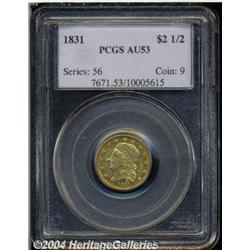 <B>1831<$2 1/2> AU53 PCGS.</B></I> The Capped Bust Quarter Eagle series is one of the most challenging group of coins in all of U.S. numismatics. Among the Reduced Size pieces from 1829 through 1834, the 1831 is a moderately difficult date to locate. This piece is fairly typical of others we have seen over the years with semi-reflective fields, bright yellow-gold color, and quite a strong strike on each side. There are numerous small field marks throughout, but none are large or distinctive enough to merit individual mention. <BR><BR><B>Important notice:</B> Heritage usually auctions material at the rate of 200-250 lots per hour. On some occasions eBay Live bid software or the Internet may not be able to keep up with the pace of the auction. We recommend placing a realistic absentee bid now as insurance to avoid disappointment. Occasionally the auctioneer may eliminate or reject an eBay Live bid, and the auctioneer may also reopen a lot after the close of the eBay live bidding (usually because we missed an audience bid), and may reject your bid even if it shows you as the winning bidder. By bidding via eBay Live, you agree that Heritage may award the lot to another bidder at its sole discretion under the circumstances described above or any other reasonable circumstances. Since eBay bids are not shown to us until we open the lot on the floor, we treat those bids just like floor bids. In most cases the floor responds before the eBay bid is presented to us, due to Internet lag time, so for consistency we have made it a policy that floor bids are always considered first over tie eBay live bids. Also please note that all Heritage lots purchased through eBay Live carry a 20% Buyer's Premium. Please make sure you read the Terms and Conditions before you bid.