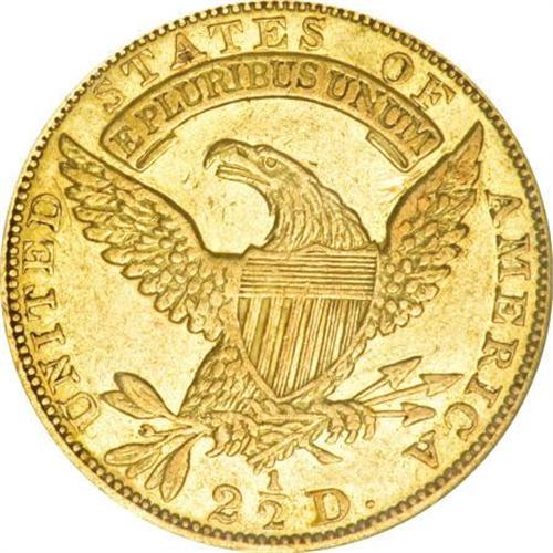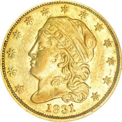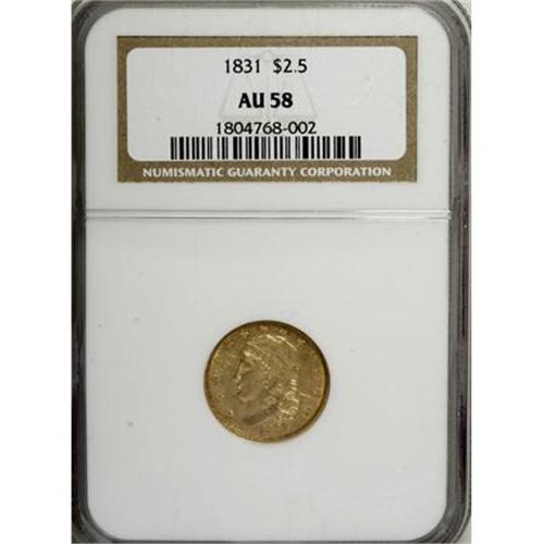 <B>1831 $2 1/2 AU58 NGC.</B></I> Breen-6134, BD-1, R.4. The only known dies, although Bowers has hinted that another die variety may exist. This example is well struck, with just a touch of weakness noted on the upper shield details. Highpoint wear is minimal for the grade. The fields are distinctly prooflike, and their prooflikeness increases near the peripheries. The surfaces display greenish-gold coloration, with strong reddish-peach accents that are somewhat deeper on the obverse. From an original mintage of 4,520 pieces, the Bass-Dannreuther work <I>Early U.S. Gold Coin Varieties</B></I> (2006) gives an estimate of just 110 to 125 survivors.<BR><BR><B>Coin Engraver:</B> John Reich<BR><BR><b>Shipping:</b> Coins & Currency (<a target="_blank" href="http://www.heritageauctions.com/common/shipping.php">view shipping information</a>)