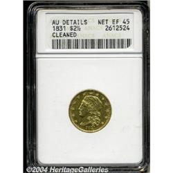 <B>1831<$2 1/2>--Cleaned--ANACS. AU Details, Net XF45.</B></I> Bass-3028, Breen-6134, R.4. The 1831 is a more difficult issue in the Capped Head Left series, comparable to the 1830 and 1832, and considerably more difficult than the 1829. Only 4,520 pieces were struck, and most of these pieces were melted shortly after production as their bullion value exceeded face. Only one die marriage is known for 1831 Quarter Eagles, all of which have a widely recut U in UNITED. The eagle's shield is not fully struck, but the remaining design details are bold. Although the fields are hairlined, substantial bright luster aids the eye appeal.<BR><I>From The Paulsboro Collection.</B></I> <BR><BR><B>Important notice:</B> Heritage usually auctions material at the rate of 200-250 lots per hour. On some occasions eBay Live bid software or the Internet may not be able to keep up with the pace of the auction. We recommend placing a realistic absentee bid now as insurance to avoid disappointment. Occasionally the auctioneer may eliminate or reject an eBay Live bid, and the auctioneer may also reopen a lot after the close of the eBay live bidding (usually because we missed an audience bid), and may reject your bid even if it shows you as the winning bidder. By bidding via eBay Live, you agree that Heritage may award the lot to another bidder at its sole discretion under the circumstances described above or any other reasonable circumstances. Since eBay bids are not shown to us until we open the lot on the floor, we treat those bids just like floor bids. In most cases the floor responds before the eBay bid is presented to us, due to Internet lag time, so for consistency we have made it a policy that floor bids are always considered first over tie eBay live bids. Also please note that all Heritage lots purchased through eBay Live carry a 20% Buyer's Premium. Please make sure you read the Terms and Conditions before you bid.