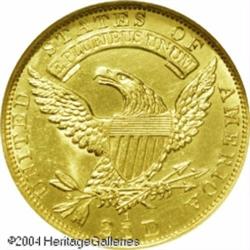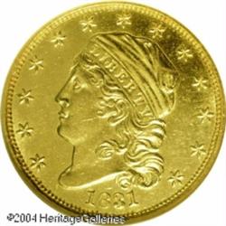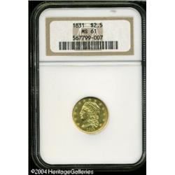 1831 $2 1/2 MS61 NGC. An obvious rarity with a min <B>1831 $2 1/2 MS61 NGC.</B></I> An obvious rarity with a mintage of only 4,520 pieces. Of that number very few survive today, but the ones that do still exist are rather high quality with the average piece being XF-AU with quite a few Mint State pieces among those extant. This piece shows a plentiful amount of the normally deep reflectivity in the fields. The striking details are not quite complete, but well brought up in most areas with only slight softness noted at the juncture of the eagle's left wing and shield. Bright, lustrous surfaces for the grade, the coin shows only small abrasions scattered in the fields, none of which are large enough to merit individual mention. A rare opportunity for the advanced gold collector. <BR><BR><B>Important notice:</B> Heritage usually auctions material at the rate of 200-250 lots per hour. On some occasions eBay Live bid software or the Internet may not be able to keep up with the pace of the auction. We recommend placing a realistic absentee bid now as insurance to avoid disappointment. Occasionally the auctioneer may eliminate or reject an eBay Live bid, and the auctioneer may also reopen a lot after the close of the eBay live bidding (usually because we missed an audience bid), and may reject your bid even if it shows you as the winning bidder. By bidding via eBay Live, you agree that Heritage may award the lot to another bidder at its sole discretion under the circumstances described above or any other reasonable circumstances. Since eBay bids are not shown to us until we open the lot on the floor, we treat those bids just like floor bids. In most cases the floor responds before the eBay bid is presented to us, due to Internet lag time, so for consistency we have made it a policy that floor bids are always considered first over tie eBay live bids. Also please note that all Heritage lots purchased through eBay Live carry a 20% Buyer's Premium. Please make sure you read the Terms and Conditions before you bid. This lot is being auctioned in conjunction with a live floor auction by Heritage Galleries & Auctioneers. All final auction and invoice information will be supplied by Heritage Galleries & Auctioneers, and all other information should be considered preliminary. Lot:6485