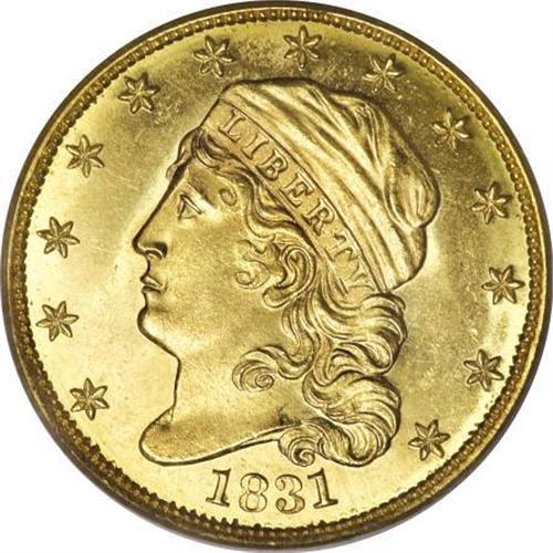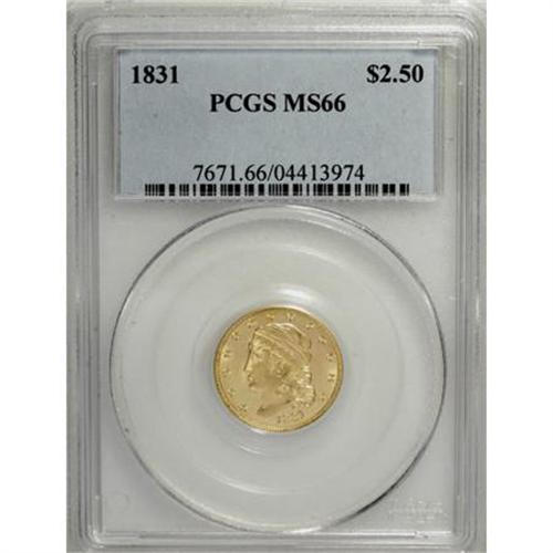 <B>1831 $2 1/2 MS66 PCGS.</B></I> Breen-6134, BD-1, R.4. Bass-Dannreuther and other modern scholarship note that there is only one die pairing for this date (although there is a rare die state with obvious clashing on both sides), which boasts an unsurprisingly small recorded mintage of 4,520 pieces. Such a mintage places this issue squarely in the ranks of a "neither high nor low" emission for this generally oft-neglected series. Bass-Dannreuther assign a middling R.4 rarity rating as well, estimating that 110-125 pieces are known. <BR> For much of their early history and well into the mid-19th century, gold quarter eagles were the Rodney Dangerfield of coins, "getting no respect" from mint personnel who were much more intent on producing the three workhorse coins of the early Mint era: copper large cents, silver half dollars, and gold half eagles. Walter Breen, speaking of the early days of the quarter eagle series in his <I>Complete Encyclopedia, </B></I>writes that "during this whole decade [1796-1807], quarter eagles were coined only in isolated driblets of a few hundred or at most a few thousand pieces. In most of these years, each date represented a new design modification--creating instant rarities and type coins. The problem is less why the coins are rare, why so few were made to begin with, but why any were struck at all! To judge from available Archives records, they were ordered on whim by a few local banks (principally the Bank of Pennsylvania and the Bank of the United States); to judge from the condition of survivors, they spent most of their time in vaults. Between 1803 and 1833, the Mint's major output consisted of cents, half dollars, and half eagles; all other denominations had a kind of poor-relative status--seldom called for, few made, little welcome."<BR> The reverse die of the 1831 quarter eagle began as a new die for the 1830 issue, also known through a single die pairing, and that reverse continued in use through the single-marriage 1832, 1833, and 1834 With Motto issues. There are 149 dentils on the reverse, as compared with 147 on the obverse. The U in UNITED is recut, the large 2 in the denomination has a curved base, and there is recutting on the right lower upright of the I in AMERICA. <BR> Harry Bass owned two examples of this date, as he did for all issues of the type except for 1832 and 1834, one each in proof and circulation-strike formats. John Dannreuther writes in <I>Early U.S. Gold Coin Varieties: A Study of Die States, 1795-1834 </B></I>that "there are so many coins of this date that nearly qualify as Proofs that even recent auctions listings must be taken with several grains of salt." In any event, suffice it to say that coins of this issue are frequently found both in high Mint State grades and with many, if not necessarily all, of the characteristics of true proof coinage. <BR> The present example is one of only two pieces so graded of the issue at PCGS, with a single MS67 better at that service, while NGC has certified four coins in MS66 and none finer (11/07). This coin, of course, has great significance for the type or date collector of this elusive and much-melted series. For the entire Capped Bust quarter eagle type spanning the years 1808 through 1834, PCGS has certified only a dozen MS66 pieces, with another half-dozen finer--and, as always, including the inevitable possibility of duplication.<BR> While the coin is extremely well produced, it otherwise shows few characteristics of a true proofs aside from near-pristine surfaces and a nearly full strike. All of the obverse stars show full centril details. There are a few tiny irregularities noted on the obverse dentils, undoubtedly present in the die as they are present on other coins of this issue including the Bass pieces. For example, a minuscule "extra dentil point" appears to have broken off near star 2, and a couple of the dentils underneath the 18 and last 1 in the date appear extra long and sharp. A small planchet indentation, near star 12 as struck, will serve as a pedigree identifier. A second small indentation appears on the reverse in the vertex between the rear of the eagle's neck and the right (facing) wing, along with some faint contact marks beneath the N in UNUM. A curious outline of mint frost is present around the devices, while the remainder of the coin shows bright, flashy prooflike fields. Rich yellow-gold color is seen over each side of this phenomenal coin.<BR><I>From The Madison Collection.</B></I><BR><BR><B>Coin Engraver:</B> John Reich<BR><BR><b>Shipping:</b> Coins & Currency (<a target="_blank" href="http://www.heritageauctions.com/common/shipping.php">view shipping information</a>)
