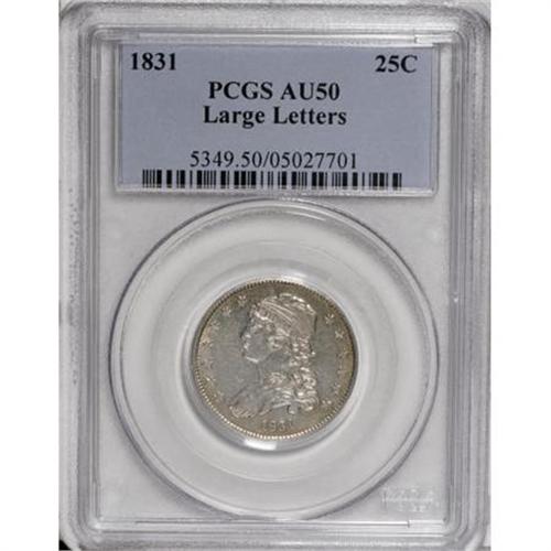 <B>1831 25C Large Letters AU50 PCGS.</B></I> B-5, R.2. The interesting repunched date variety with large 1s over small 1s. This well struck Bust quarter has light gold toning near the borders, but is otherwise brilliant. No marks merit individual description.<BR><BR><B>Coin Engraver:</B> William Kneass<BR><BR><b>Shipping:</b> Coins & Currency (<a target="_blank" href="http://www.heritageauctions.com/common/shipping.php">view shipping information</a>)