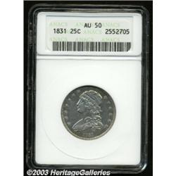 1831 25C Small Letters AU50 ANACS. B-2, R.1. The devices and borders have shimmering luster. A richly detailed Bust Quarter with relatively unmarked surfaces and peripheral hints of golden-brown color.From the Morris Geiger Collection. Important notice: Heritage usually auctions material at the rate of 200-250 lots per hour. On some occasions eBay Live bid software or the Internet may not be able to keep up with the pace of the auction. We recommend placing a realistic absentee bid now as insurance to avoid disappointment. Occasionally the auctioneer may eliminate or reject an eBay Live bid, and the auctioneer may also reopen a lot after the close of the eBay live bidding (usually because we missed an audience bid), and may reject your bid even if it shows you as the winning bidder. By bidding via eBay Live, you agree that Heritage may award the lot to another bidder at its sole discretion under the circumstances described above or any other reasonable circumstances. Also please note that all Heritage lots purchased through eBay Live carry a 20% Buyer's Premium. Please make sure you read the Terms and Conditions before you bid.