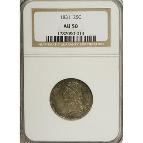<B>1831 25C Small Letters AU50 NGC.</B></I> NGC Census: (20/308). PCGS Population (30/238). Mintage: 398,000. Numismedia Wsl. Price for NGC/PCGS coin in AU50: $555. (#5348)<BR><BR><b>Shipping:</b> Coins & Currency (<a target="_blank" href="http://www.heritageauctions.com/common/shipping.php">view shipping information</a>)