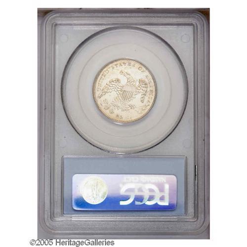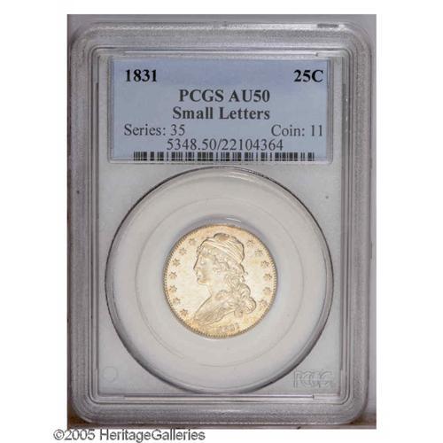 <B>1831<25C> Small Letters AU50 PCGS.</B></I> B-2, R.2. Struck from an intermediate state of the dies with all the cracks present, but they have not progressed to blobs yet. Sharply defined throughout, the surfaces are lightly worn with muted luster and a few small contact marks. A few streaks and dabs of golden-tan color are all that interrupt the otherwise untoned appearance of this coin.
