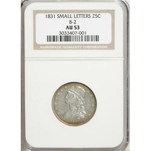 <B>1831 25C Small Letters AU53 NGC.</B></I> B-2, R.2. Orange-gold toning visits the margins of this partly lustrous and alertly struck Capped Bust type coin. A few thin subdued marks are encountered on the upper reverse field.<BR><BR><B>Coin Engraver:</B> William Kneass<BR><BR><b>Shipping:</b> Coins & Currency (<a target="_blank" href="http://www.heritageauctions.com/common/shipping.php">view shipping information</a>)