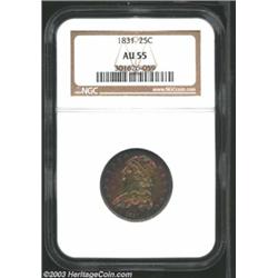 <TABLE cellSpacing=0 cellPadding=0 width="100%" bgColor=#000000 border=0><TBODY><TR><TD width="100%"><TABLE cellSpacing=1 cellPadding=3 width="100%" border=0><TBODY><TR><TD width="100%" bgColor=#79735c><FONT face=arial color=#ffffff size=3><B>Description</B> </FONT></TD></TR><TR><TD width="100%" bgColor=#ffffff><FONT face=arial size=2><B>1831 25C Small Letters AU55 NGC.</B></I> B-2, R.1. A spindly die crack connects the arrowheads. Ruby-red and sea-green colors invigorate the obverse, while the reverse has golden-brown, electric-blue, and mauve patina. A splendidly detailed example that has a couple of minor contact marks.<BR><I>From The Jones Beach Estate, Part I.</B></I> </FONT></TD></TR></TBODY></TABLE></TD></TR></TBODY></TABLE><BR><A name=PricesRealized></A><TABLE cellSpacing=0 cellPadding=0 width="100%" bgColor=#000000 border=0><TBODY><TR><TD width="100%"><TABLE cellSpacing=1 cellPadding=3 width="100%" border=0><TBODY><TR><TD width="100%" bgColor=#79735c><A name=PR><FONT face=arial color=#ffffff size=3><B>Previous Prices from Heritage Auctions</B> </FONT></A></TD></TR><TR><TD bgColor=#f6f6ed><TABLE cellSpacing=0 cellPadding=0 width="100%" border=1><TBODY><TR><TD align=middle width="33%"><B>Date</B></TD><TD align=middle width="33%"><B>Service</B></TD><TD align=middle width="33%"><B>Price</B></TD></TR><TR bgColor=whitesmoke><TD width="33%"><B>05/31/2003</B></TD><TD width="33%">PCGS</TD><TD width="33%">$603.75</TD></TR><TR bgColor=whitesmoke><TD width="33%"><B>10/07/2001</B></TD><TD width="33%">ANACS</TD><TD width="33%">$379.50</TD></TR></TBODY></TABLE></TD></TR><TR><TD bgColor=#ffffff><FONT face=arial size=1 ?>PLEASE NOTE: All prices realized reflect the final hammer price PLUS the buyer's premium in auctions that charge a buyer's premium. Each item has a notation at the top of the listing indicating whether that lot included a buyer's premium. Example: A item that sells with a final hammer price of $100 and a 20% buyer's premium will display with a price realized of $120. All information listed is intended to be as accurate as possible, but errors are possible. Please use this guide carefully and inform us of any inaccuracies. </FONT></TD></TR></TBODY></TABLE></TD></TR></TBODY></TABLE><BR><TABLE cellSpacing=0 cellPadding=0 width="100%" bgColor=#000000 border=0><TBODY><TR><TD width="100%"><TABLE cellSpacing=1 cellPadding=3 width="100%" border=0><TBODY><TR><TD width="100%" bgColor=#79735c colSpan=6><FONT face=arial color=#ffffff size=3><B>Price Guide*</B> </FONT></TD></TR><TR bgColor=#f6f6ed><TD align=middle><B>Grade</B> </TD><TD align=middle><B>Coin World<BR>(Trends)</B> </TD><TD align=middle><B>Numismedia<BR>Retail</B> </TD><TD align=middle><B>Numismedia<BR>Wholesale</B> </TD><TD align=middle><B>Coin<BR>Universe</B> </TD><TD align=middle><B>Heritage<BR>Value Index</B> </TD></TR><TR bgColor=#ffffff><TD align=middle>53</TD><TD align=right>---</TD><TD align=right>$550.00</TD><TD align=right>$458.00</TD><TD align=right>---</TD><TD align=right>$435.11</TD></TR><TR style="FONT-WEIGHT: bold" bgColor=#cccfdd><TD align=middle>55</TD><TD align=right>$625.00</TD><TD align=right>$565.00</TD><TD align=right>$471.00</TD><TD align=right>$680.00</TD><TD align=right>$505.44</TD></TR><TR bgColor=#ffffff><TD align=middle>58</TD><TD align=right>---</TD><TD align=right>$650.00</TD><TD align=right>$540.00</TD><TD align=right>$750.00</TD><TD align=right>$553.45</TD></TR><TR bgColor=#ffffff><TD colSpan=6><FONT size=1>*All information listed is intended to be as accurate as possible, but errors are possible. No item may be returned or refused based on this information which is provided as a service to our customers. You should contact each pricing source directly to determine the accuracy of this information. </FONT></TD></TR></TBODY></TABLE></TD></TR></TBODY></TABLE><BR><TABLE cellSpacing=0 cellPadding=0 width="100%" bgColor=#000000 border=0><TBODY><TR><TD width="100%"><TABLE cellSpacing=1 cellPadding=3 width="100%" border=0><TBODY><TR><TD width="100%" bgColor=#79735c><FONT face=arial color=#ffffff size=3><B>Population Guide</B> </FONT></TD></TR><TR bgColor=#ffffff><TD align=middle><!-- Begin Output of Population Grid--><TABLE cellSpacing=0 cellPadding=0 width="100%" border=0><TBODY><TR><TD vAlign=center><TABLE cellSpacing=0 width="100%" border=1 cellsadding="3"><TBODY><TR><TD vAlign=center><TABLE cellSpacing=0 cellPadding=3 width="100%" border=1><TBODY><TR><TD vAlign=center align=middle bgColor=#f0f1e8 colSpan=2 <CENTER><FONT face=Arial size=2><B>PCGS Pop </B></FONT><CENTER></CENTER></TD><TD vAlign=center align=middle bgColor=#f0f1e8 colSpan=2><CENTER><FONT face=Arial size=2><B>NGC Pop</B></CENTER></FONT></TD></TR><TR><TD vAlign=center><FONT face=Arial size=2>(55)</FONT> </TD><TD vAlign=center align=right><FONT face=Arial size=2>33</FONT> </TD><TD vAlign=center><FONT face=Arial size=2>(55)</FONT> </TD><TD vAlign=center align=right><FONT face=Arial size=2>14</FONT> </TD></TR><TR><TD vAlign=center><FONT face=Arial size=2>(>55)</FONT> </TD><TD vAlign=center align=right><FONT face=Arial size=2>158</FONT> </TD><TD vAlign=center><FONT face=Arial size=2>(>55)</FONT> </TD><TD vAlign=center align=right><FONT face=Arial size=2>205</FONT> </TD></TR></TBODY></TABLE></TD></TR></TBODY></TABLE></TD></TR></TBODY></TABLE><!-- End Output of Population Grid--> Important notice: Heritage usually auctions material at the rate of 200-250 lots per hour. On some occasions eBay Live bid software or the Internet may not be able to keep up with the pace of the auction. We recommend placing a realistic absentee bid now as insurance to avoid disappointment. Occasionally the auctioneer may eliminate or reject an eBay Live bid, and the auctioneer may also reopen a lot after the close of the eBay live bidding (usually because we missed an audience bid), and may reject your bid even if it shows you as the winning bidder. By bidding via eBay Live, you agree that Heritage may award the lot to another bidder at its sole discretion under the 