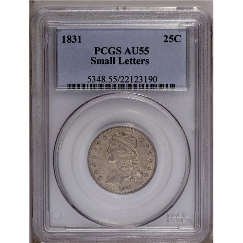 <B>1831 25C Small Letters AU55 PCGS.</B></I> B-1, R.3. A rising die crack through STATES identifies the variety. A well struck golden-gray piece that exhibits ample luster and has only a few moderate obverse ticks.