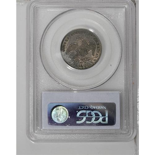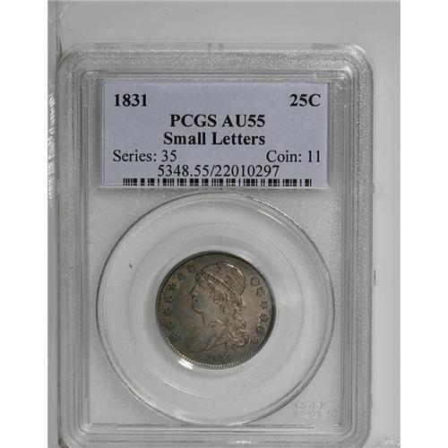 <B>1831<25C> Small Letters AU55 PCGS.</B></I> B-2, R.2. Light highpoint wear appears at the wings and hair. Nicely struck for the era with gold, violet, and blue-gray patina.