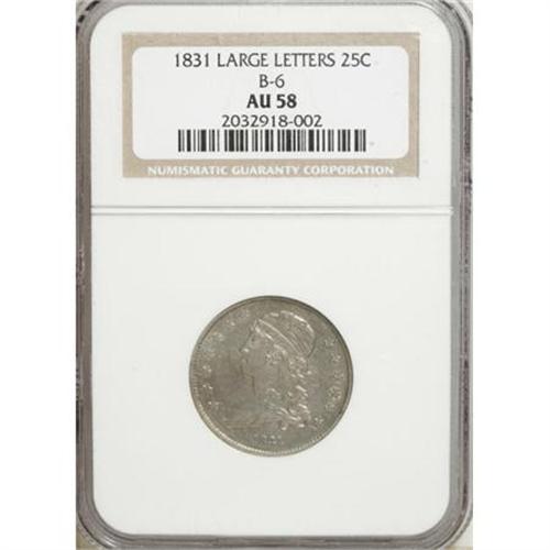 <B>1831 25C Large Letters AU58 NGC.</B></I> B-6, R.4. Lovely violet-steel surfaces, with nice remaining luster underneath. Lightly abraded, with a few faint pinscratches beneath the eagle's right (facing) wing. NGC has not certified another example of the B-6 variety any finer than AU58 (10/07). <BR><BR><B>Coin Engraver:</B> William Kneass<BR><BR><b>Shipping:</b> Coins & Currency (<a target="_blank" href="http://www.heritageauctions.com/common/shipping.php">view shipping information</a>)