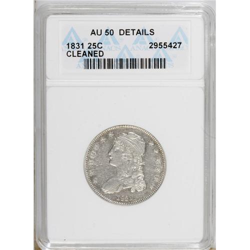 <B>1831 25C Small Letters--Cleaned--ANACS. AU50 Details.</B></I> NGC Census: (20/302). PCGS Population (30/238). Mintage: 398,000. Numismedia Wsl. Price: $555. (#5348)<BR><BR><b>Shipping:</b> Coins & Currency (<a target="_blank" href="http://www.heritageauctions.com/common/shipping.php">view shipping information</a>)