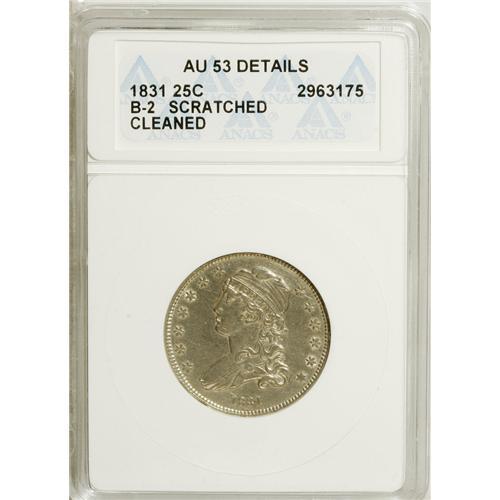 <B>1831 25C Small Letters--Cleaned, Scratched--ANACS. AU53 Details.</B></I> B-2. NGC Census: (16/291). PCGS Population (13/225). Mintage: 398,000. Numismedia Wsl. Price for NGC/PCGS coin in AU53: $565. (#5348)<BR><BR><b>Shipping:</b> Coins & Currency (<a target="_blank" href="http://www.heritageauctions.com/common/shipping.php">view shipping information</a>)