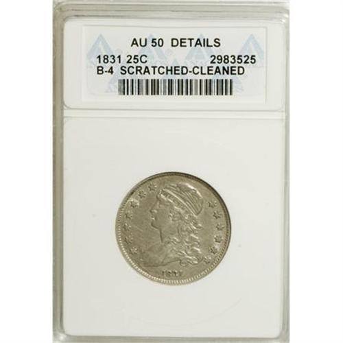 <B>1831 25C Small Letters--Cleaned, Scratched--ANACS. AU50 Details.</B></I> B-4. NGC Census: (20/312). PCGS Population (30/238). Mintage: 398,000. Numismedia Wsl. Price for NGC/PCGS coin in AU50: $555. (#5348)<BR><BR><b>Shipping:</b> Coins & Currency (<a target="_blank" href="http://www.heritageauctions.com/common/shipping.php">view shipping information</a>)