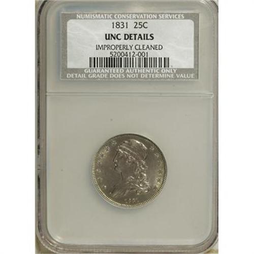 <B>1831 25C Small Letters--Improperly Cleaned--NCS. Unc Details.</B></I> NGC Census: (5/195). PCGS Population (6/144). Mintage: 398,000. Numismedia Wsl. Price for NGC/PCGS coin in MS60: $900. (#5348)<BR><BR><B>Coin Engraver:</B> William Kneass<BR><BR><b>Shipping:</b> Coins & Currency (<a target="_blank" href="http://www.heritageauctions.com/common/shipping.php">view shipping information</a>)